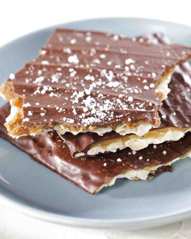 - Remove foil tent and spread melted chocolate over matzah to cover; sprinkle with sea salt. Transfer matzah to refrigerator and let chill at least 2 hours.