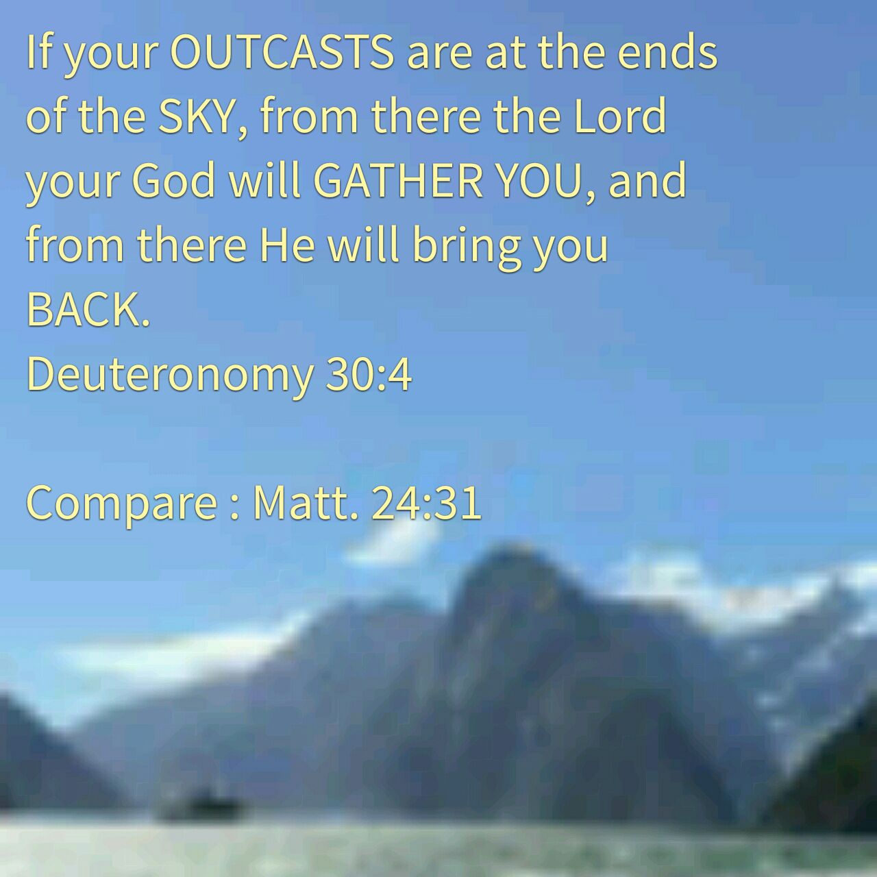 Anyone who wants to understand Yeshua’s words in Matthew 24:31 concerning the signs in the heavens and the angels sent to gather the elect MUST recognize that Yeshua cites Deuteronomy 30:4 with the direct reference (see the Hebrew) when he says, “…from one end of the sky to the other…” The conditions for this gathering have not been met, yet!